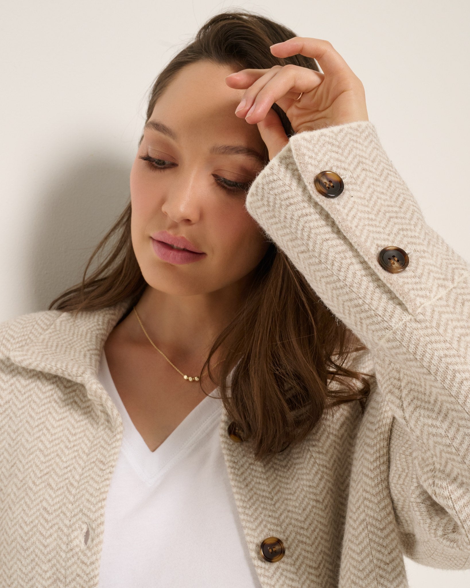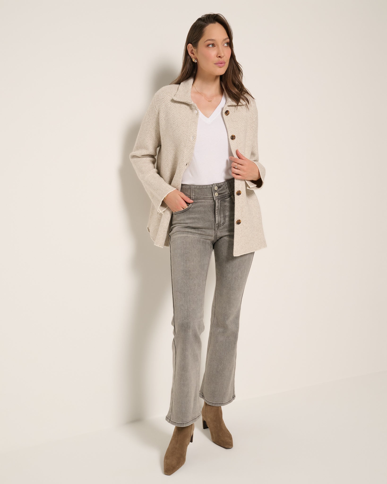 A sprinkle of old-school pattern meets new-school ease. With its soft structure, button-up front, and cozy pockets, this herringbone shacket makes any outfit feel just a little more polished.