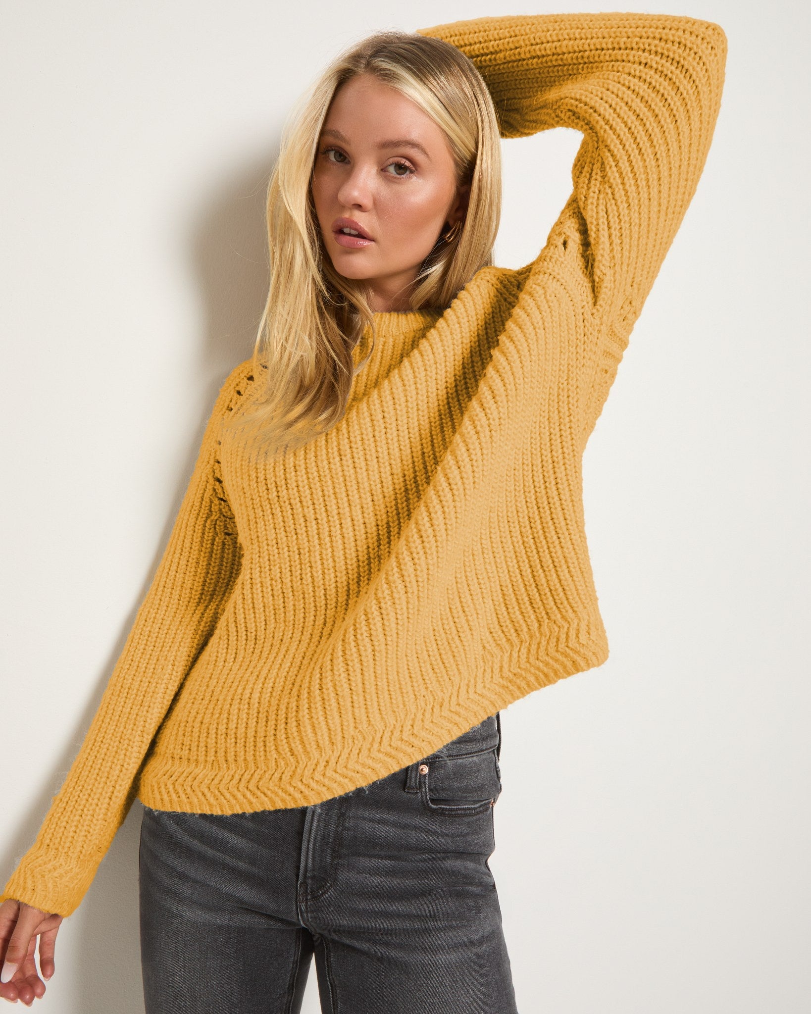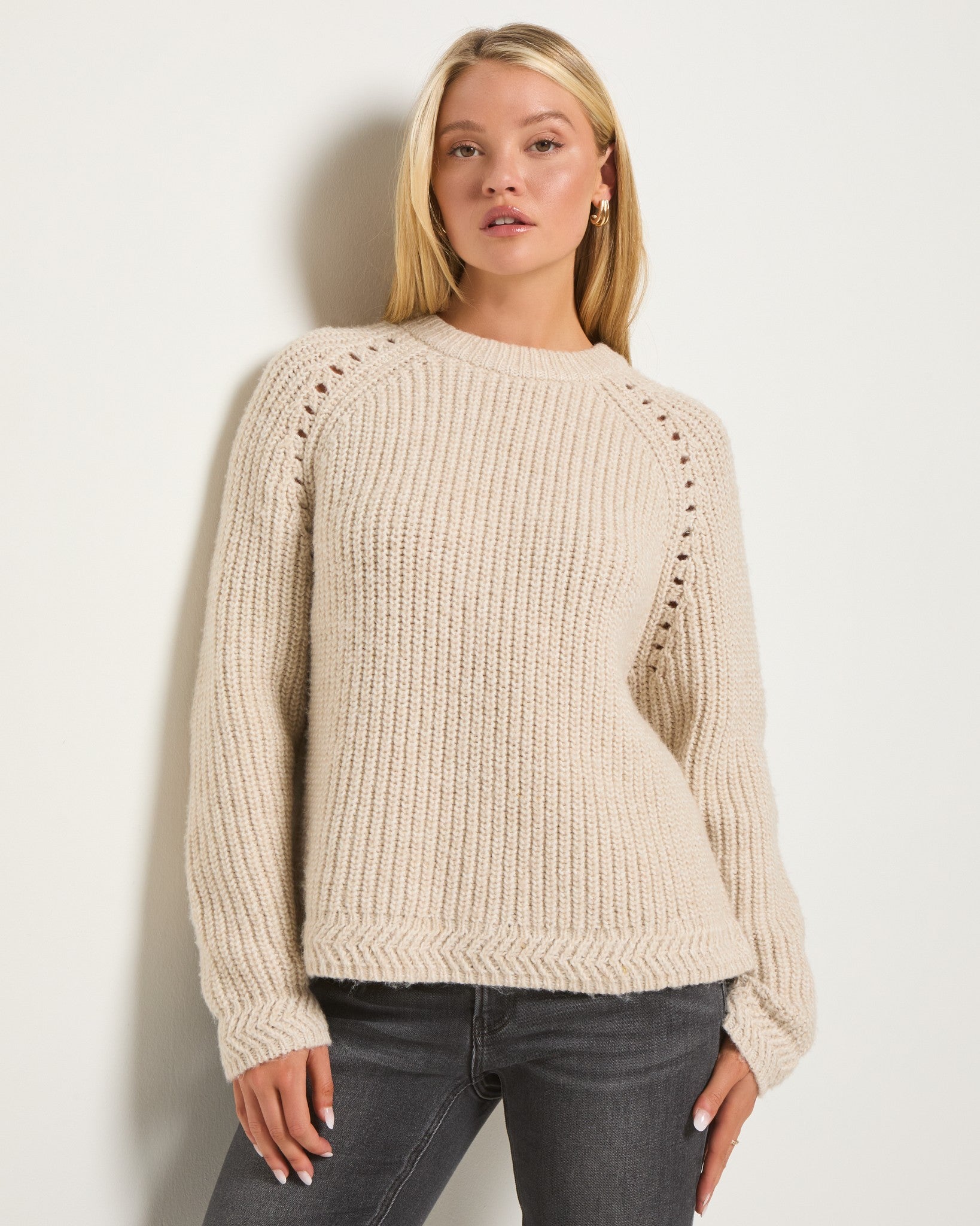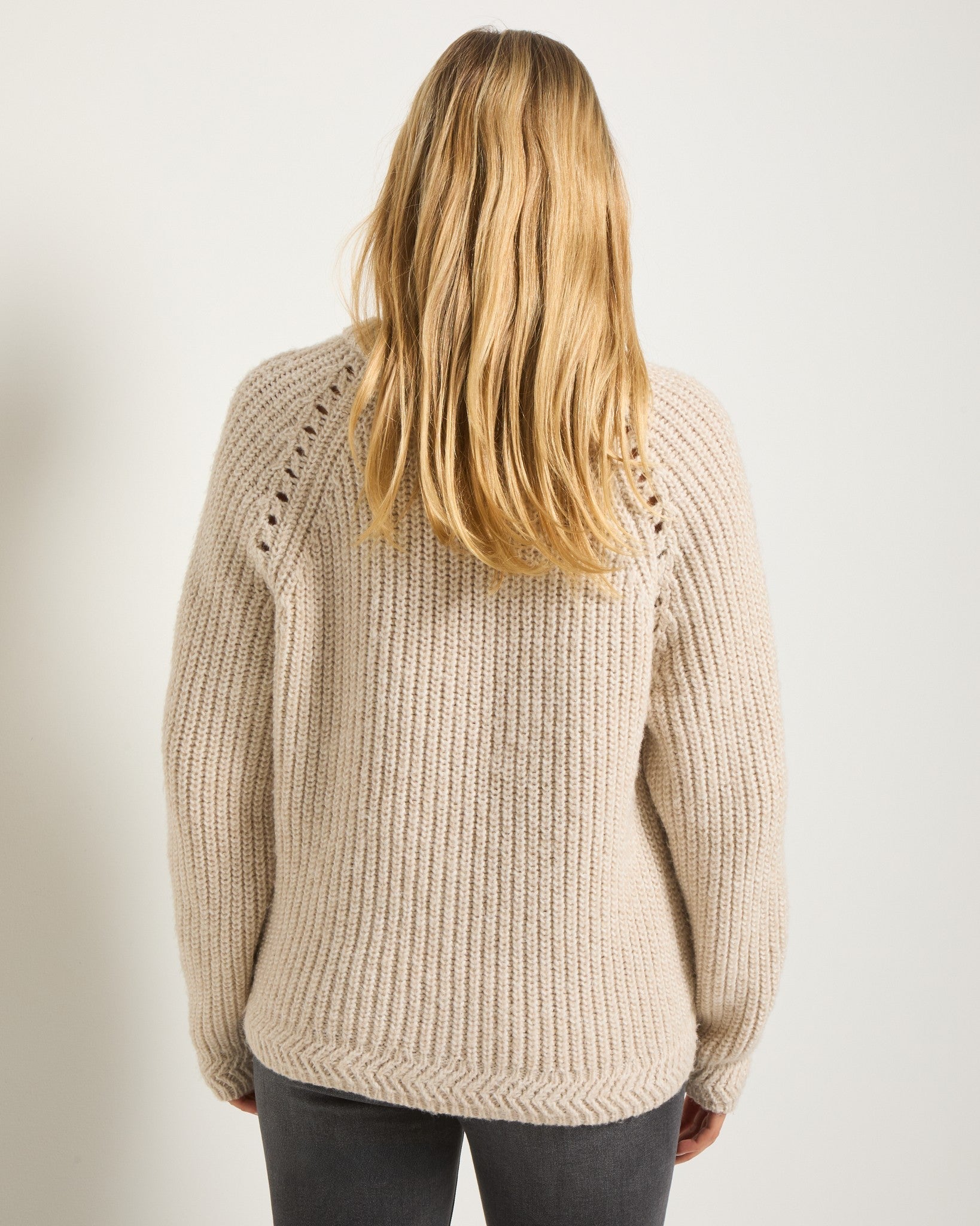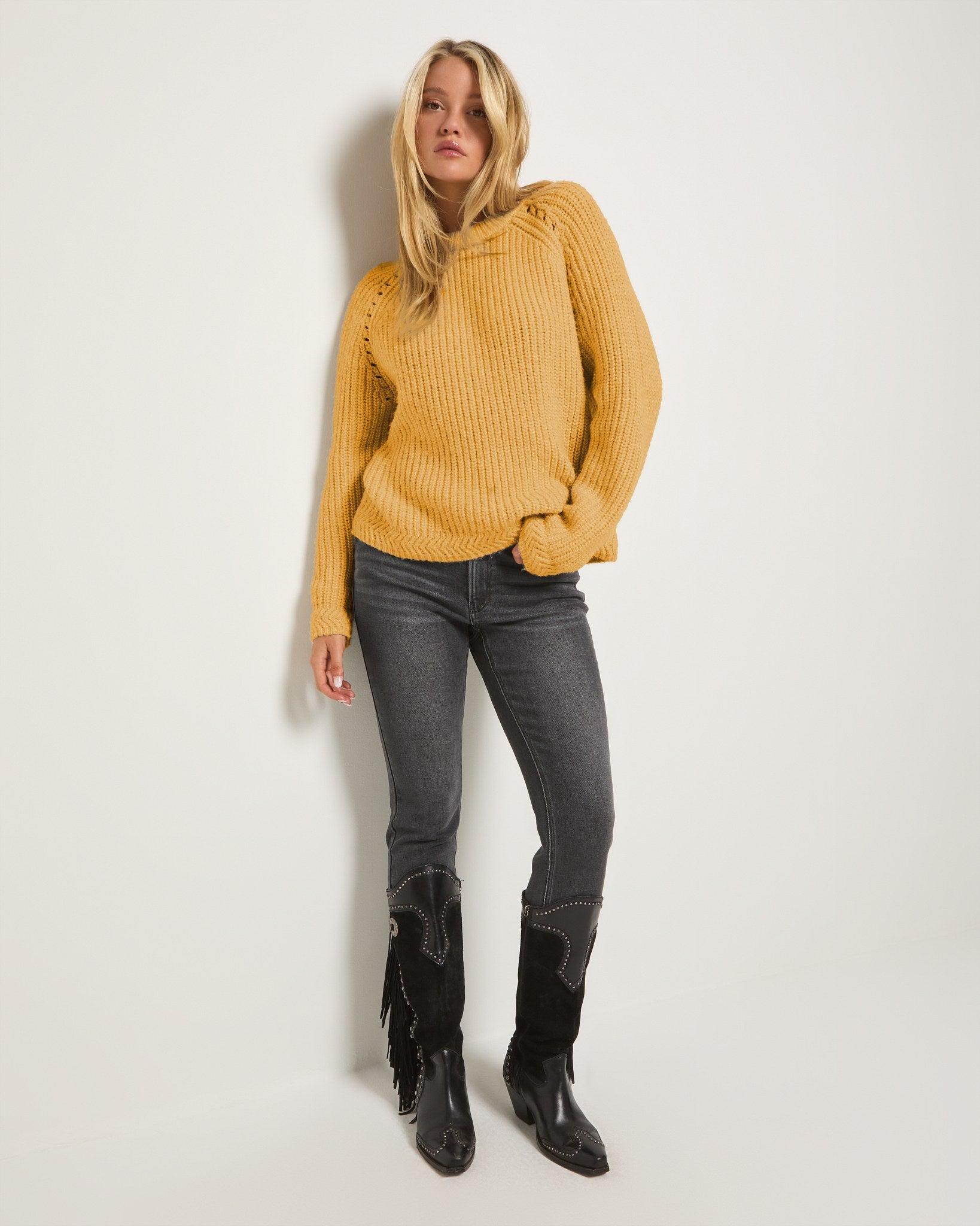 For sunset drives and stargazing stops. With raglan sleeves, a cozy texture, and chevron detail at the hem, this sweater’s got just enough western grit to ride along—and it’s made with recycled fibers, too.