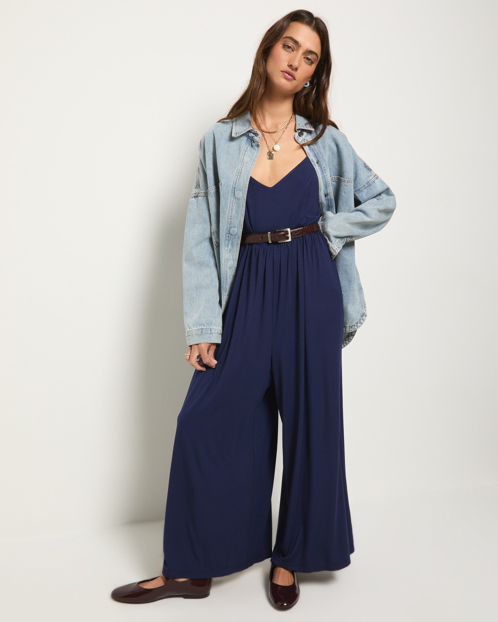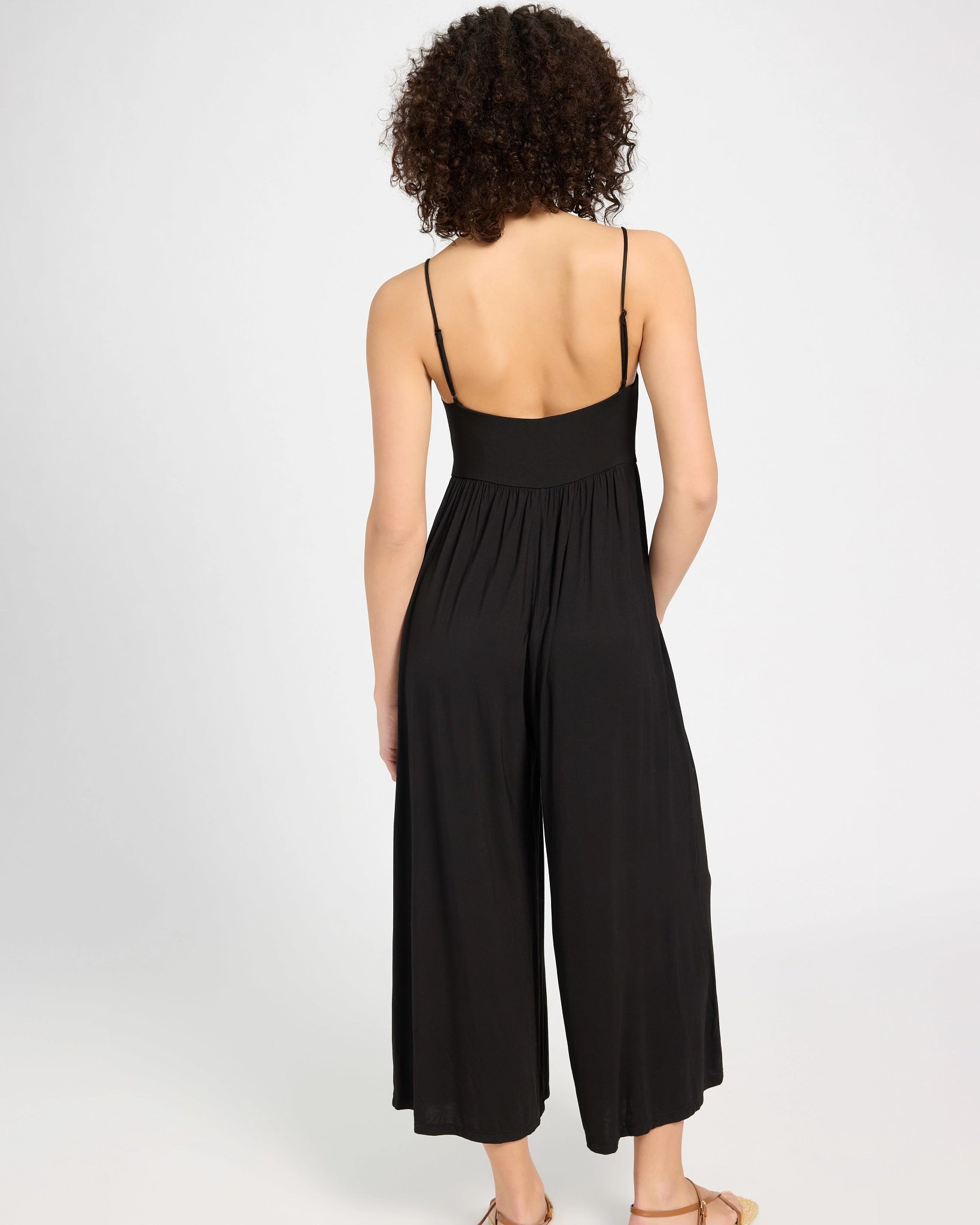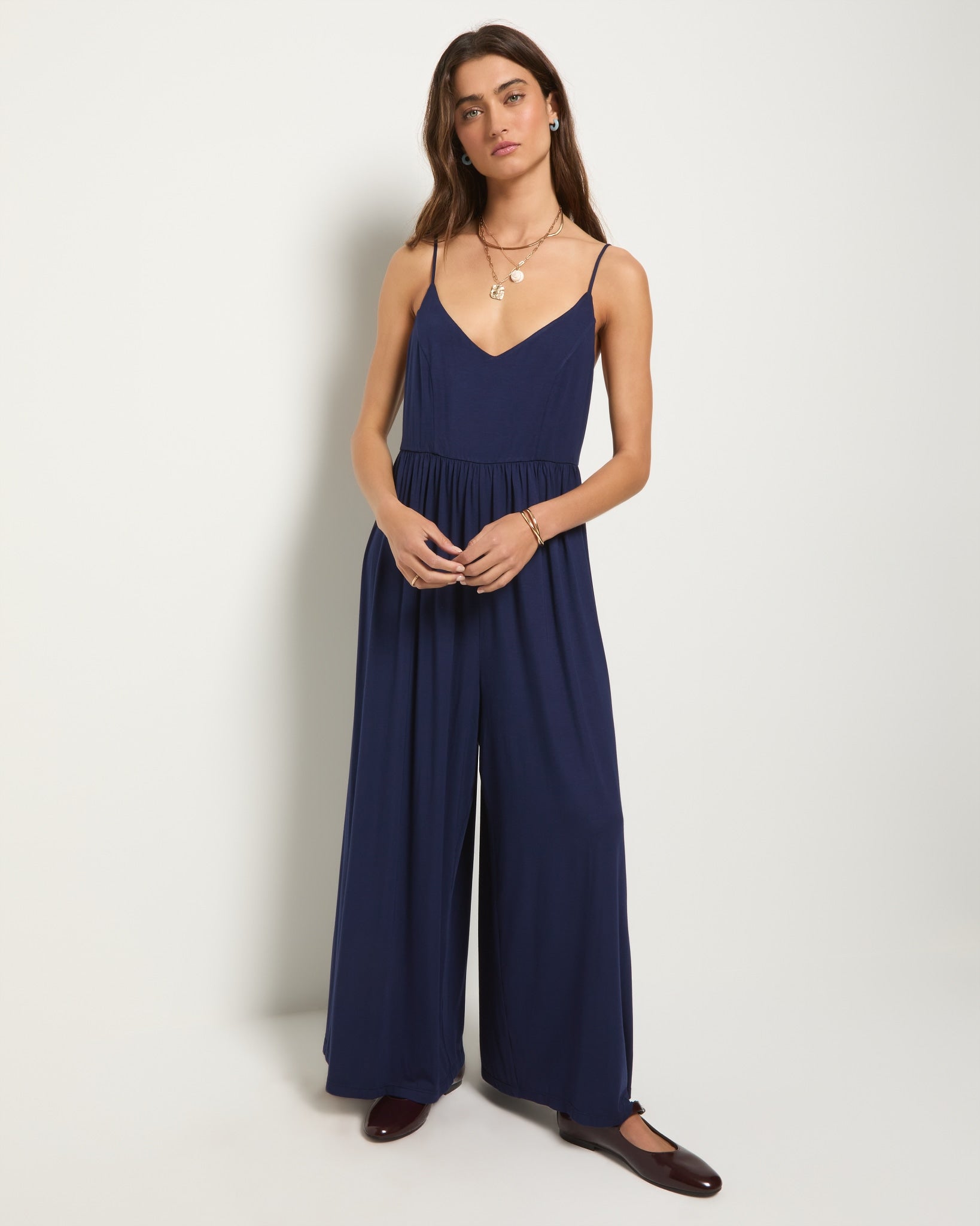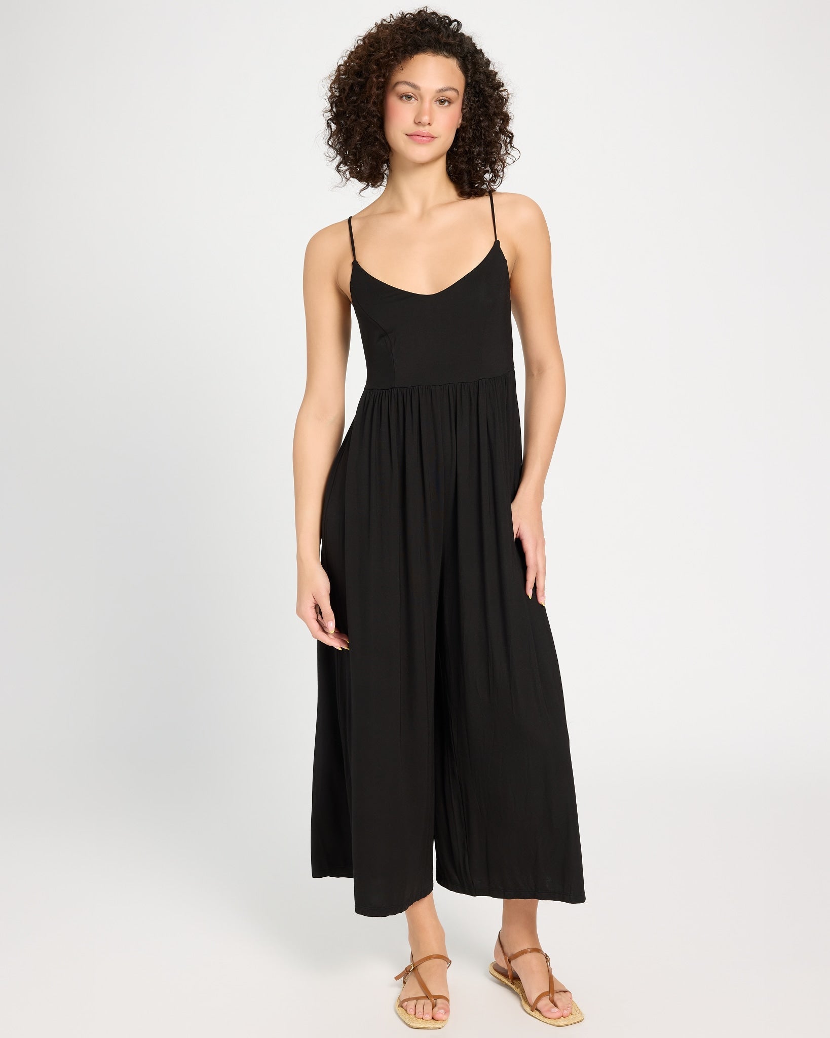 One and done. This effortlessly breezy jumpsuit features a flattering V-neck, adjustable spaghetti straps, and a babydoll waist for an easy, flowy fit. Wide-leg pants add just the right amount of movement—because looking good should always feel this relaxed.