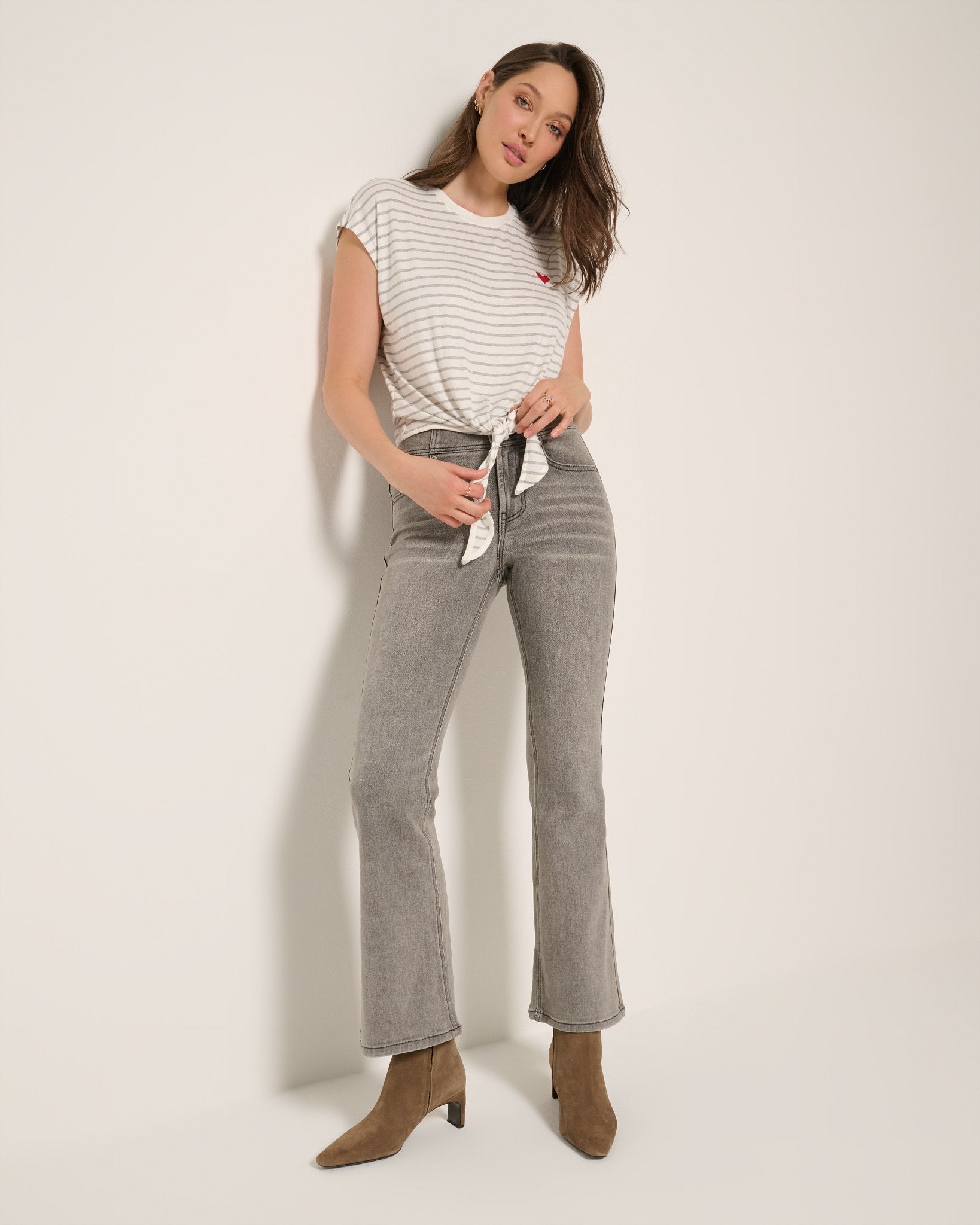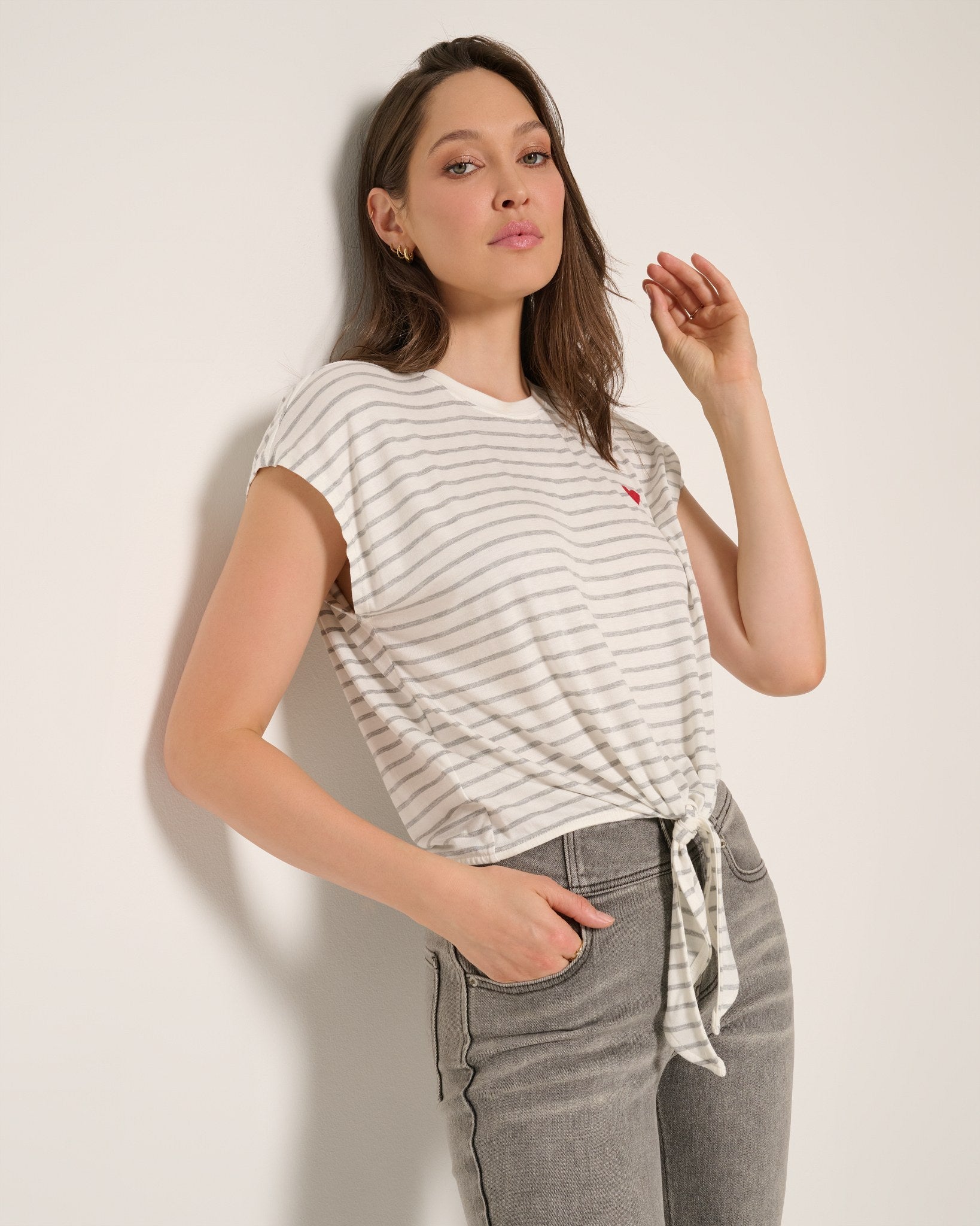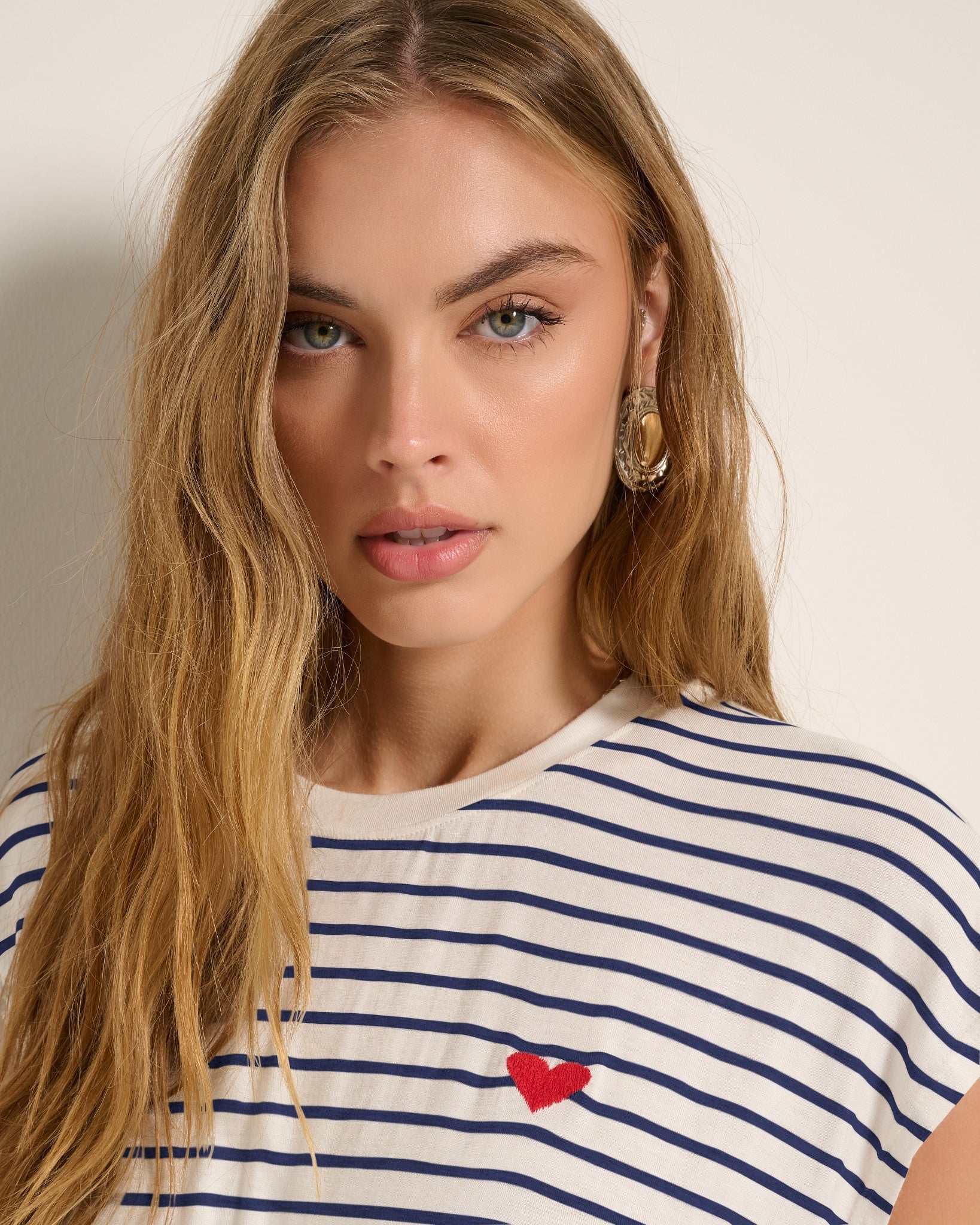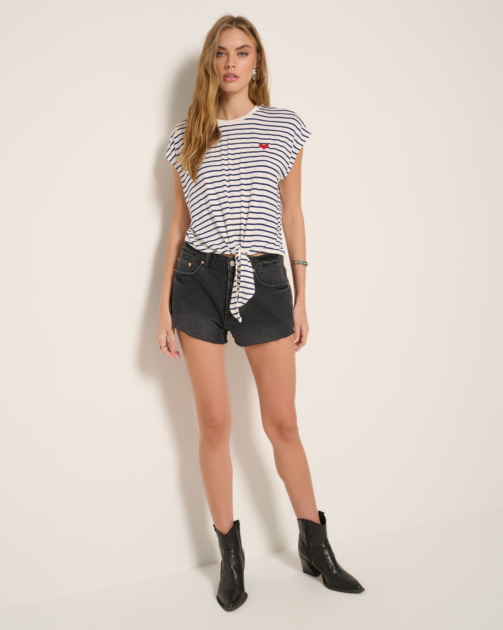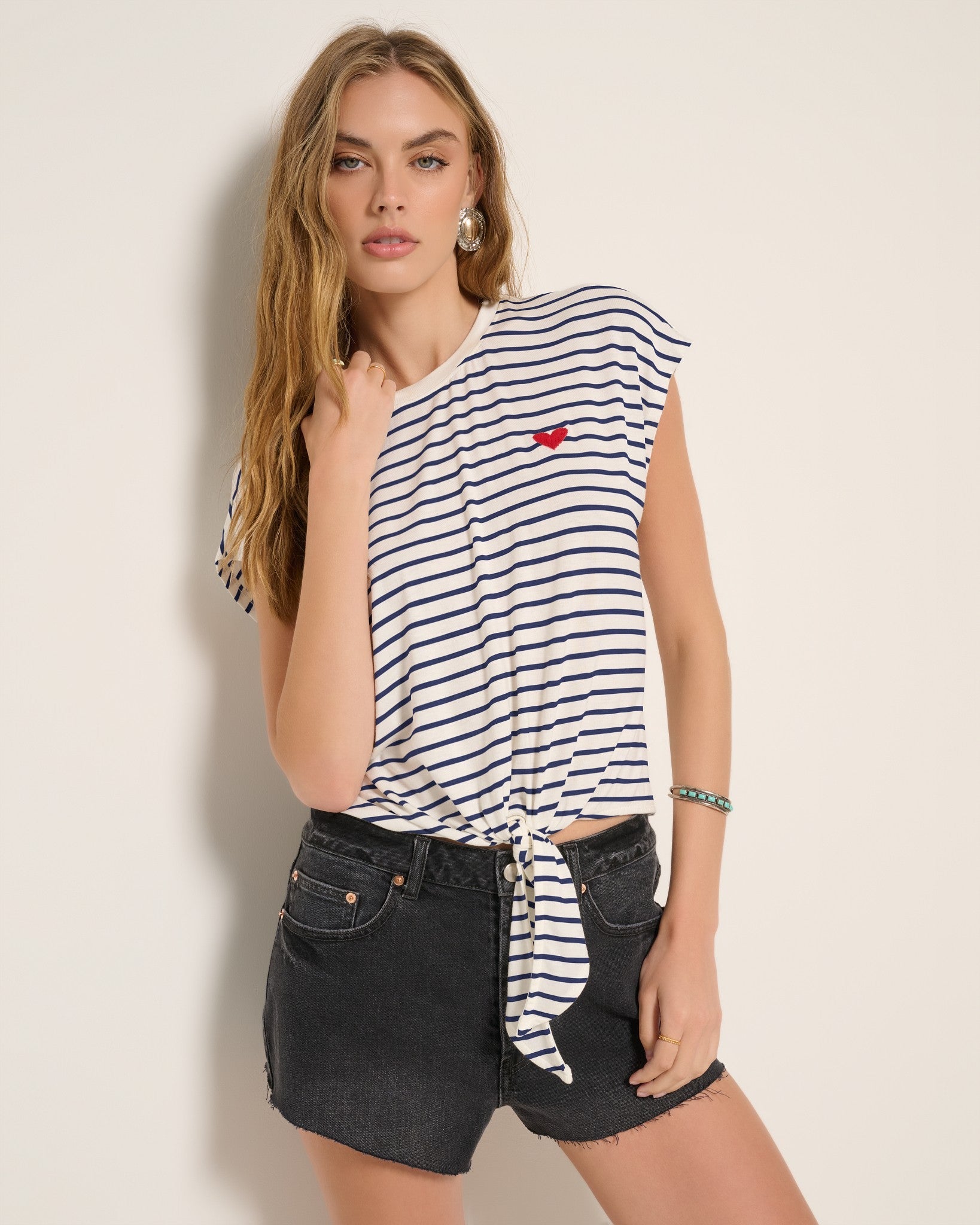 The kind of tee that becomes an instant favorite. With its timeless stripes, embroidered heart, and knotted hem, this one brings effortless charm to everything from cutoffs to denim flares.