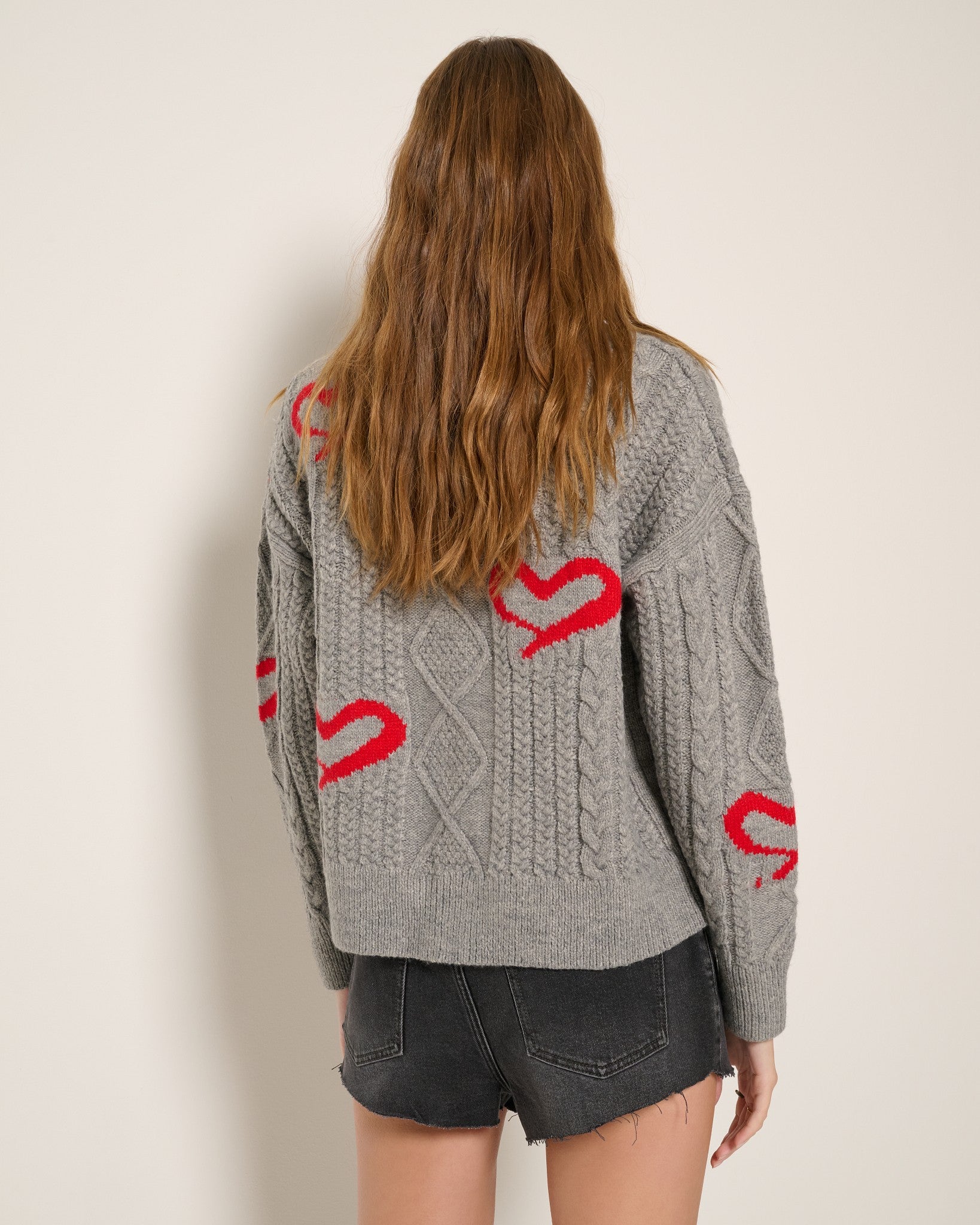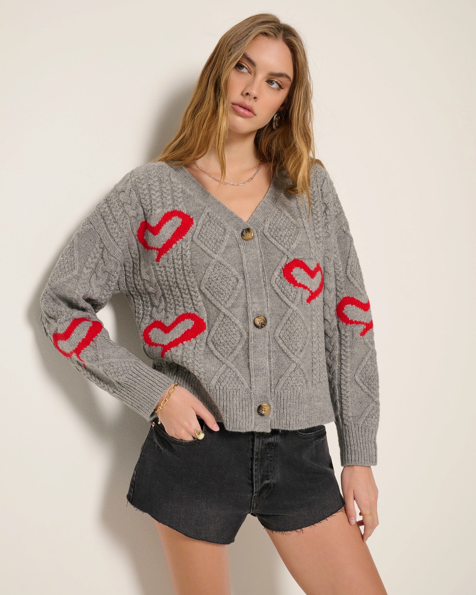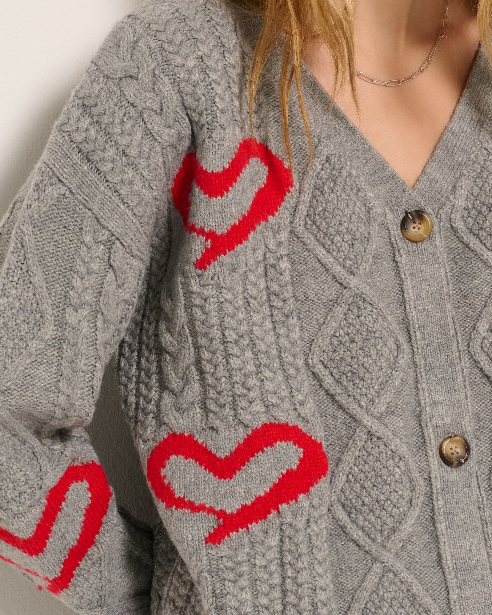 Sweetly unexpected. This button-up cardigan is soft, slouchy, and a little sentimental. Classic cable knit, heart print, and just the right amount of charm. Wear it buttoned up or layered loose for that perfectly effortless look.