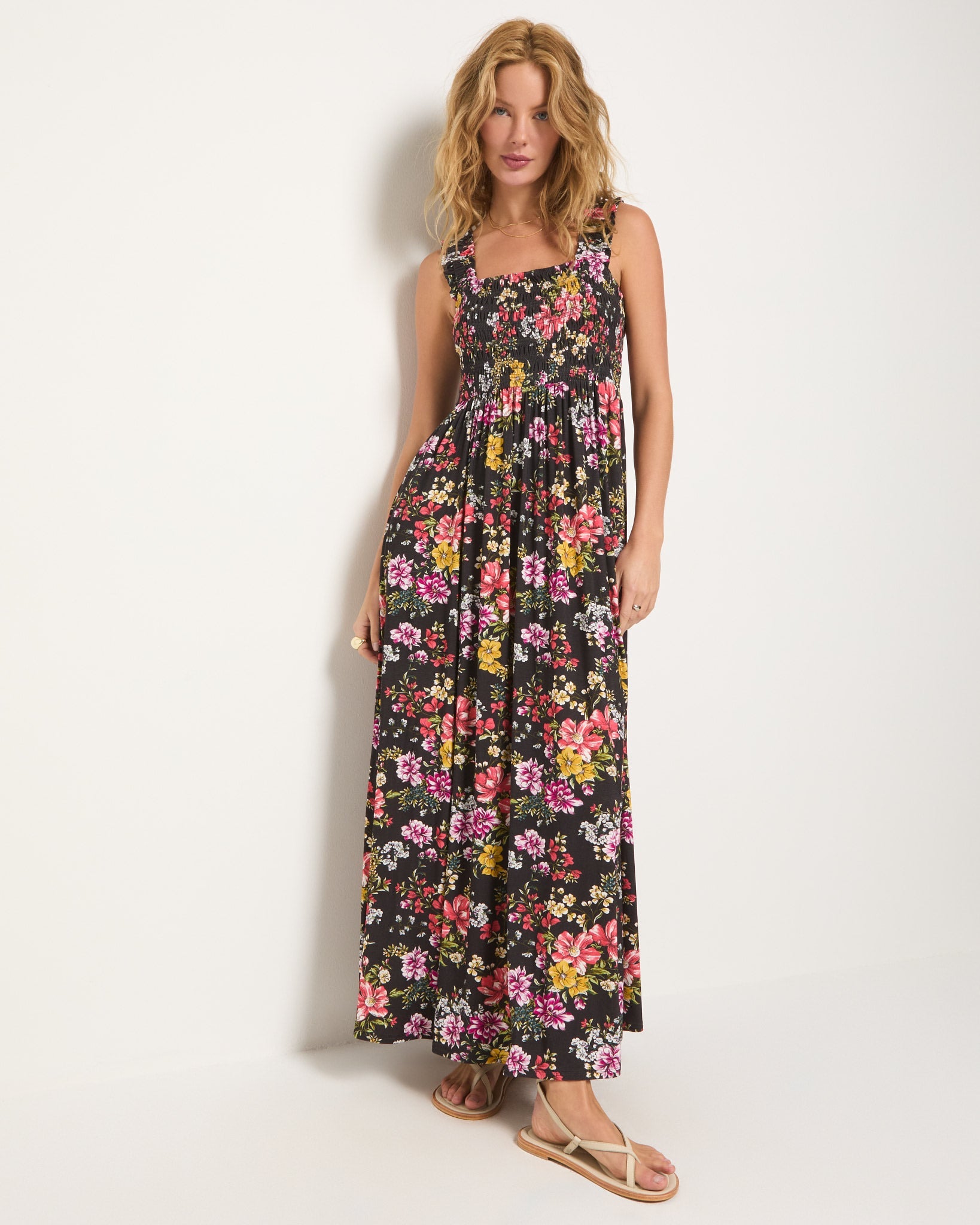 Vacation vibes, no passport needed. This printed maxi dress combines a flattering square neckline, ruffled straps, and a smocked bodice for the perfect fit. The breezy Empire waist silhouette features hidden pockets (yes, really!) and a lightweight modal blend with just the right amount of stretch. Effortless and dreamy, wherever the day takes you.